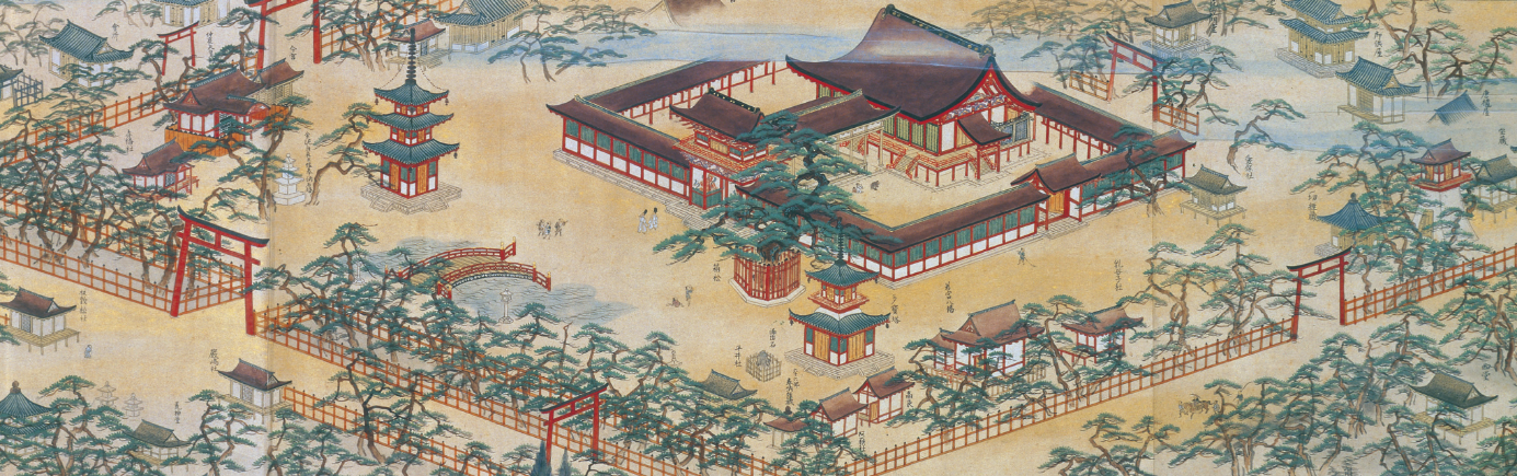 作者は幕府御用絵師 住吉広澄「筥崎宮縁起絵巻」に描かれた絵図で室町時代の筥崎宮社頭の景観がきわめて美麗な極彩色で描かれた絵巻として貴重である。